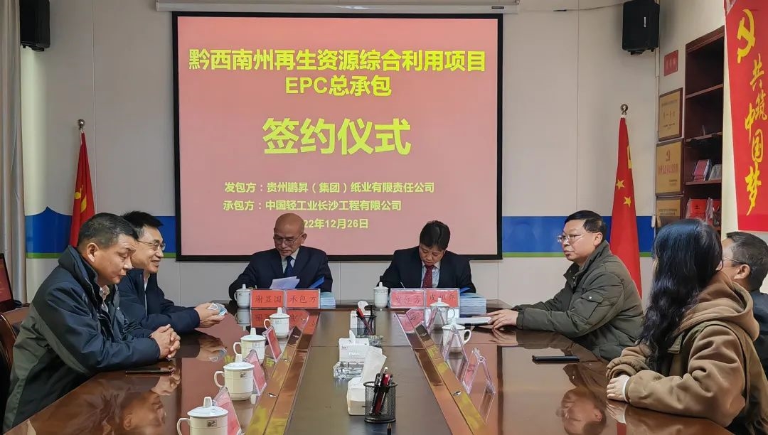 12月26日,威廉希尔中国官网所属中国轻工业长沙工程有限公司(以下简称长沙公司)与贵州鹏昇(集团)纸业有限责任公司举行黔西南州再生资源综合利用总承包合同签订仪式。威廉希尔中国官网党委副书记、总裁陈荣荣,副总裁陈志明,贵州鹏昇党委书记、董事长皮祖乔等双方领导出席仪式。长沙公司党委书记、董事长谢显国代表总承包方在合同上签字。
